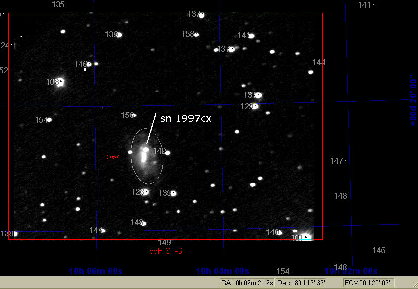 CCD Image of Supernova 1997cx in Galaxy NGC 3057 taken on 7/26/97 at 4:50 UT. It is a 12 Minute exposure using an SBIG ST-6 CCD camera thru Kopernik's 20 inch telescope (working at F/4.9). North at top; the field of view is about 9x12.5 arc minutes.